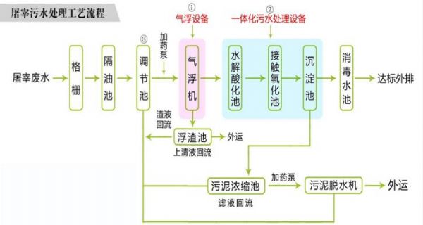 屠宰过程中将产生一定量的废水,废水主要来自屠宰后的清洗、解体冲洗和地面冲洗以及牲畜粪便废水等,废水中含有大量的有机物质,其中包括,动物粪便,血液 、畜毛,碎皮肉和油脂等有机物,属于高浓度有机废水,如果不经过处理直接排入水体,将造成水体严重营养化,破坏水体自身能力,严重影响周围环境,本设备的开发公开了屠宰污水的处理方式,涉及的污水技术处理领域中包括,干湿分离、絮凝沉降、脱色和去除氨氮的步骤,通过混合催化水并配以絮凝。除氨氮,除色等工艺大幅度提高屠宰污水的处理速度,处理时间、降低此类污水的处理成本,有利于解决屠宰厂产生的污水排放问题。